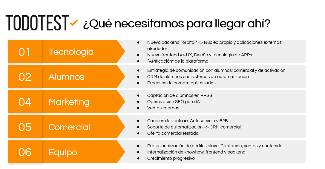 - Establecimiento de un plan realista de objetivos en cada una de las áreas a trabajar: empresa, tecnología, alumnos, marketing y comercial/ventas